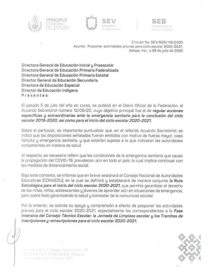 Por lo anterior, se solicita su valioso apoyo y comprensión a efecto de posponer las actividades previas para el inicio del ciclo escolar 2020-2021, especialmente las correspondientes a la Fase Intensiva del Consejo Técnico Escolar; la Jornada de limpieza escolar y los Trámites de inscripciones y reinscripciones para el ciclo escolar 2020-2021.