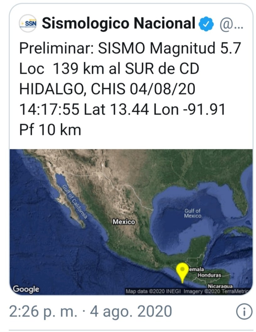 De acuerdo con el SSN, este sismo se registró a las 14:17 h con epicentro localizado 139 kilómetros al sur de Ciudad Hidalgo, en el estado de Chiapas.