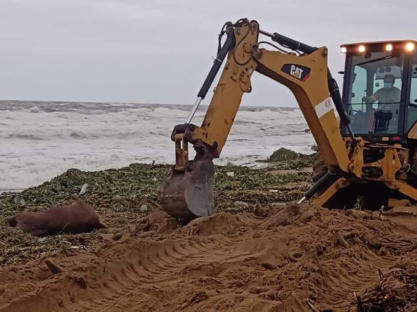 Elementos de Protección civil y personal Obras públicas enterraron a los animales que fueron arrastrados hacia la playa de villa Allende tras el alto nivel del río Coatzacoalcos a causa de las intensas lluvias