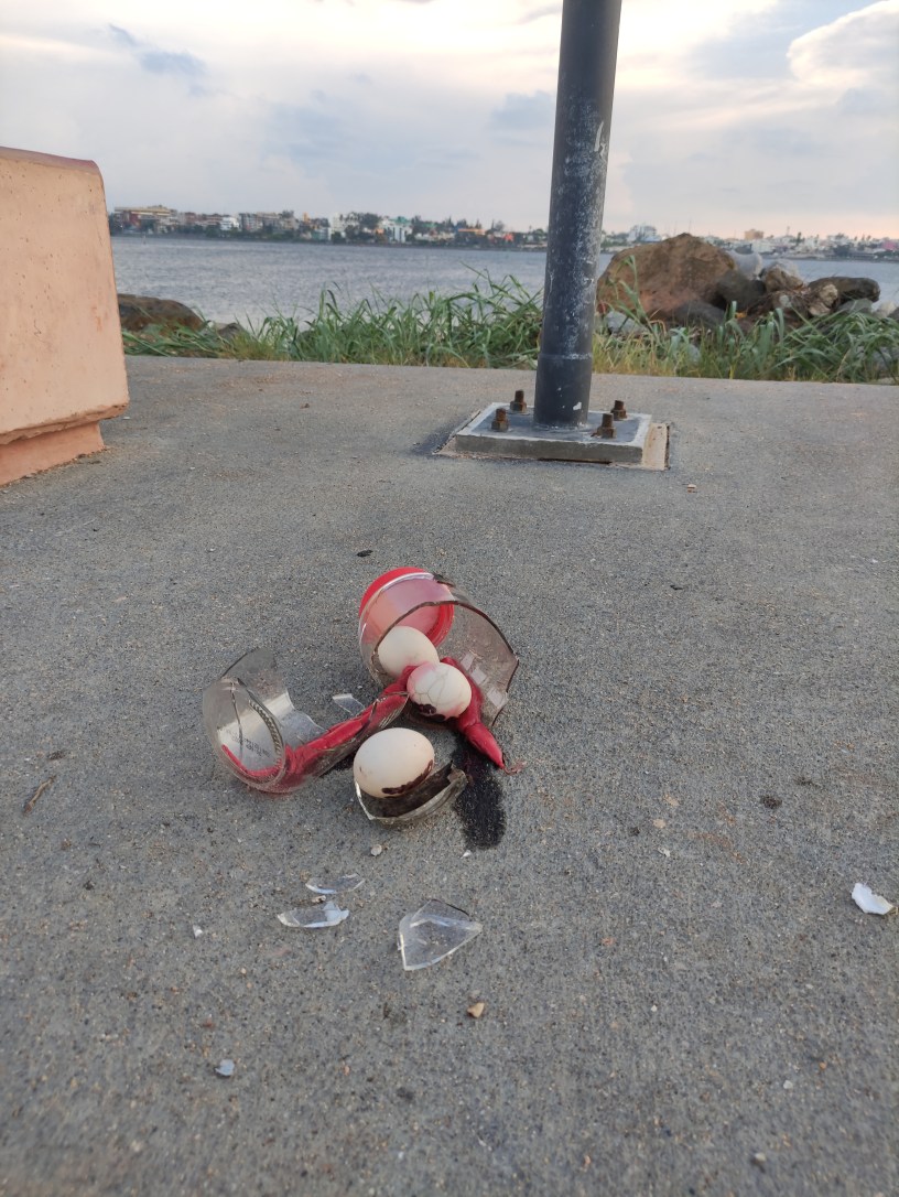 Los corredores que acuden diariamente a realizar sus ejercicios en el paseo de Las Escolleras tuvieron que desviar su carrera para evitar pisar los cristales donde fue arrojado el contenido de la presunta hechicería.