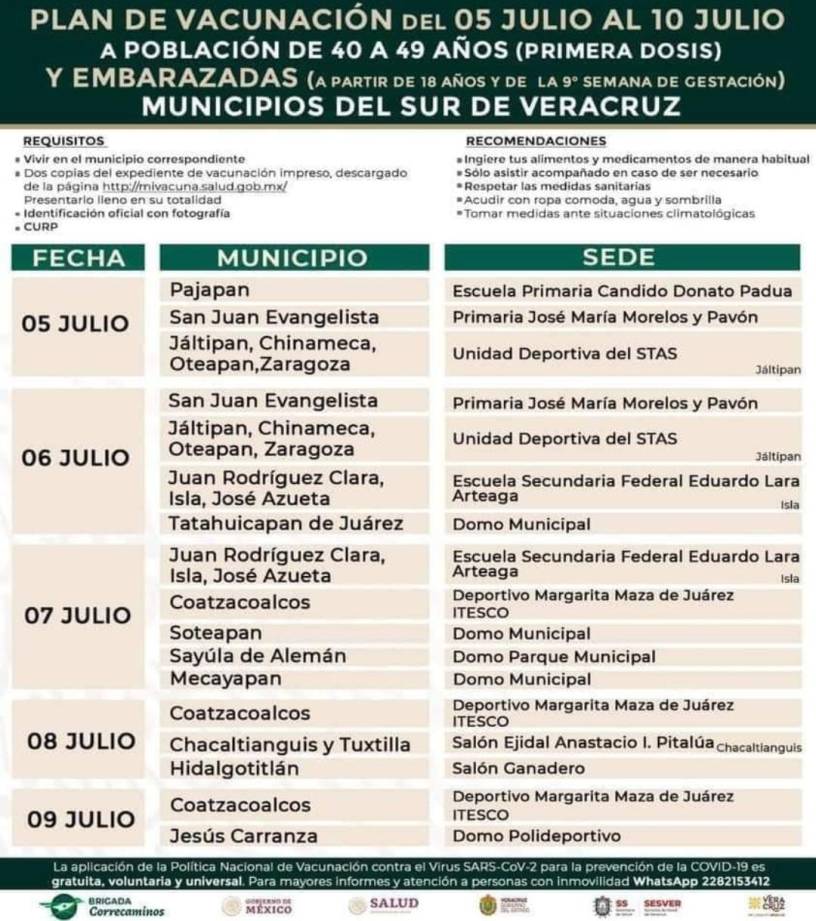 El Gobierno del Estado de #Veracruz ha informado que esta semana dará continuidad en diversos municipios, así como en #Coatzacoalcos el #PlanNacionalDeVacunación contra #Covid19, ya que esta semana, del 7 al de 9 julio se estará llevando a cabo dicha jornada para personas de 40 a 49 años (primera dosis), y embarazadas (a partir de 18 años y de la 9na semana de gestación).