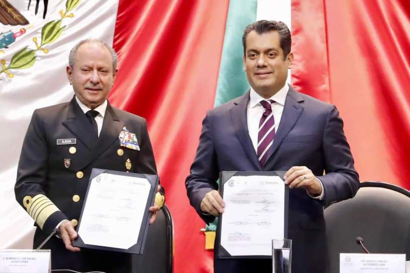 El presidente de la Cámara de Diputados, el veracruzano Sergio Gutiérrez Luna, recibió en el Palacio Legislativo de San Lázaro al secretario de Marina, el almirante José Rafael Ojeda Durán, con quien firmó un convenio de colaboración en materia de vinculación académica.