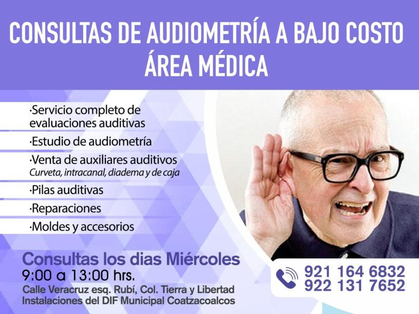 Se ofrece servicio completo de evaluación auditiva y estudio de audiometría con el pago de una cuota muy por debajo de los costos comerciales, así como venta de auxiliares auditivos, pilas auditivas, reparaciones, moldes y accesorios a precios muy accesibles.