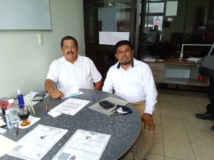 El profesor Juan Francisco Martínez Guzmán conocido como ‘El profe Chapeta’ en compañía de su suplente el taxista Juan Carlos Sánchez Torres se registró como candidato a la agencia municipal de Villa Allende ante la Junta Municipal Electoral de Coatzacoalcos.