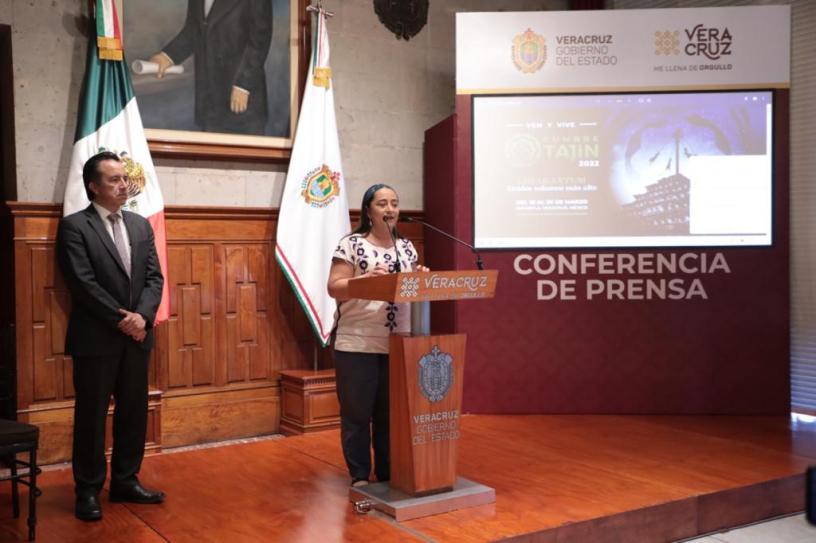 Xalapa, Ver., 14 de marzo de 2022.- En conferencia del gobernador Cuitláhuac García Jiménez, la titular de la Secretaría de Turismo y Cultura (SECTUR), Xochitl Arbesú Lago, reiteró la invitación a Cumbre Tajín, cuya organización tiene listas más de 500 actividades culturales, artísticas y de aprendizaje en una comunidad viva y milenaria como es el Totonacapan, del 18 al 20 de marzo.