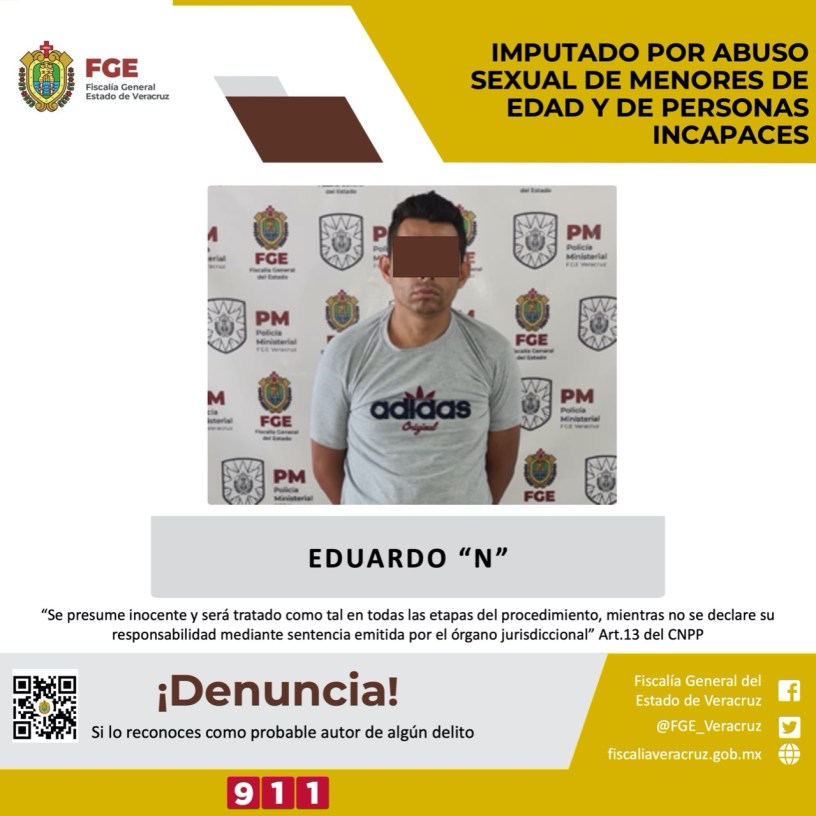 Veracruz, Ver.La Fiscalía General del Estado obtuvo a través de la Fiscalía Especializada en Investigación de Delitos en contra de la Familia, Mujeres, Niñas y Niños y Trata de Personas, imputación en contra de Eduardo “N” por su presunta participación en el delito de abuso sexual de menores de edad y de personas incapaces, cometido en agravio de una niña de identidad reservada.