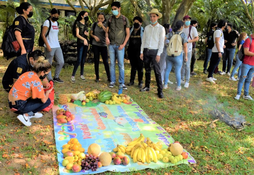 Durante el evento organizado por la Facultad de Fisioterapia UNAM en el jardín principal de la US se hizo una oración para dar gracias la madre tierra por sus dones compartidos, encendieron el fuego, caminaron descalzos, abrazaron un árbol y crearon una mándalo.