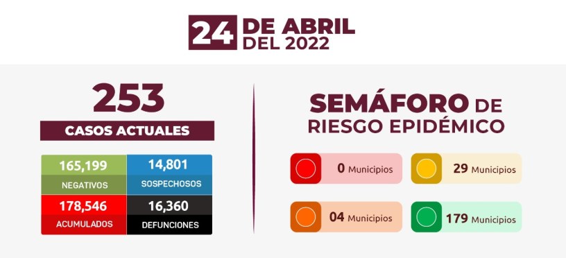 Hay 253 positivos y 92 sospechosos activos, al tiempo que van 161 mil 934 pacientes recuperados y 252 permanecen en vigilancia.