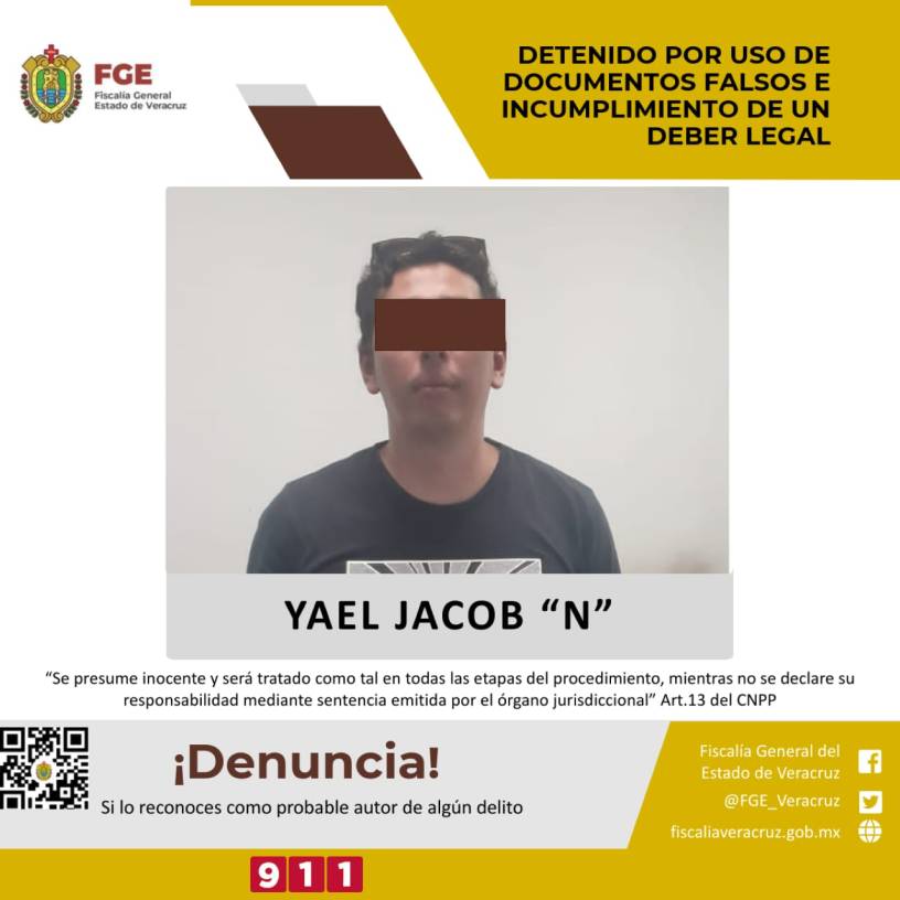 VERACRUZ, Ver; 28 abril de 2022.- La Fiscalía General del Estado, a través de la Fiscalía Regional zona centro-Veracruz, cumplimentó un mandamiento judicial en contra de Yael Jacob “N” por los presuntos delitos de uso de documentos falsos e incumplimiento de un deber legal.