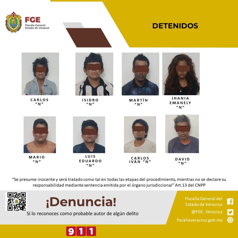 Los elementos policíacos lograron la detención de Mario “N”, Martín “N”, David “N”, Carlos Iván “N”, Luis Eduardo “N”, Jhania Emanely “N”, Isidoro “N” y Carlos “N”, con estricto respeto al debido proceso y a sus derechos humanos.