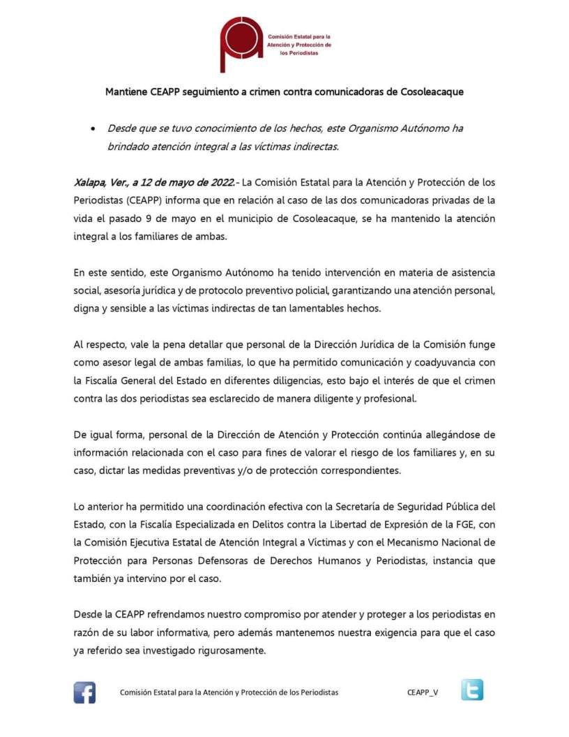 Xalapa, Ver., a 12 de mayo de 2022.- La Comisión Estatal para la Atención y Protección de los Periodistas (CEAPP) informa que en relación al caso de las dos comunicadoras privadas de la vida el pasado 9 de mayo en el municipio de Cosoleacaque, se ha mantenido la atención integral a los familiares de ambas.