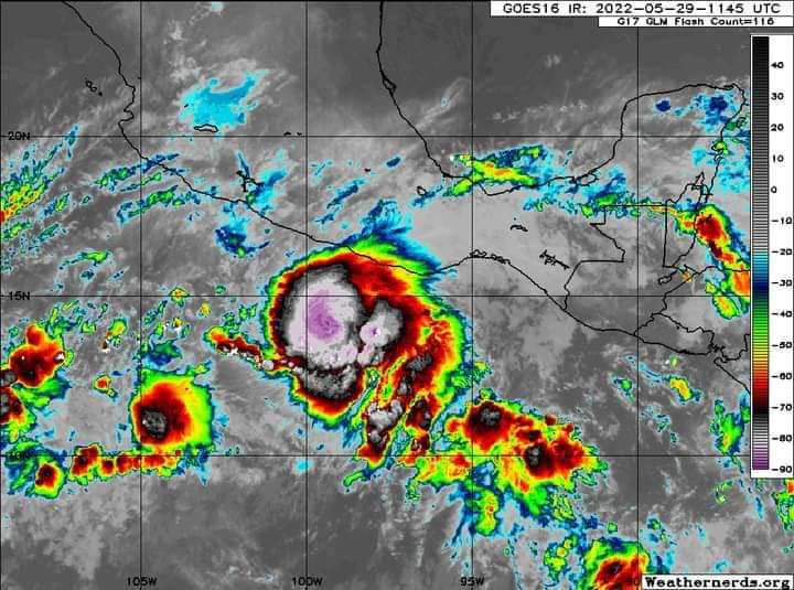 AGENCIAS. Su centro se localizó a esta hora, a 320 km al Oeste-Suroeste de Puerto Ángel, Oax., presentando vientos máximos sostenidos de 120 km/h y desplazamiento al Nor-Noroeste a 6 km/h. De acuerdo.