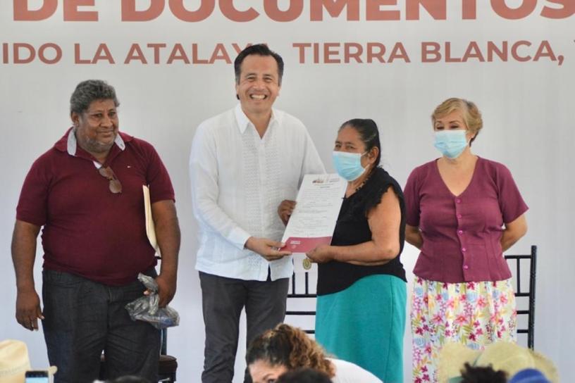 Tierra Blanca, Ver., 04 de junio de 2022.-* Con la entrega de títulos de propiedad en el ejido La Atalaya, fundado hace más de 60 años en este municipio, la Cuarta Transformación garantiza justicia social al reconocer la pertenencia de las tierras a los campesinos que las trabajan, afirmó el gobernador Cuitláhuac García Jiménez.