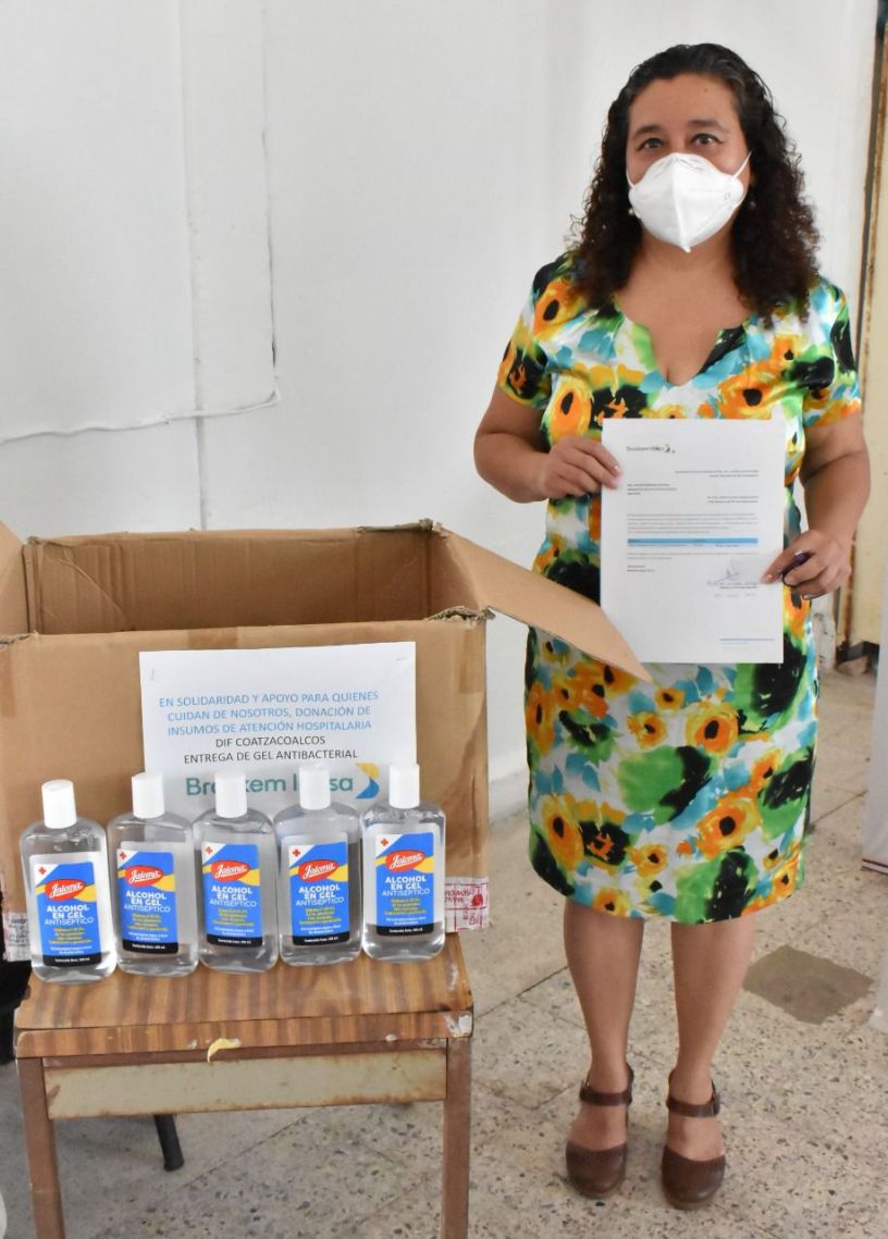 La entrega de una caja con frascos dosificadores de gel antibacterial, contribuyen al reforzamiento de las acciones sanitarias que aplica el DIF Municipal Coatzacoalcos, dentro de las medidas preventivas por Covid 19.