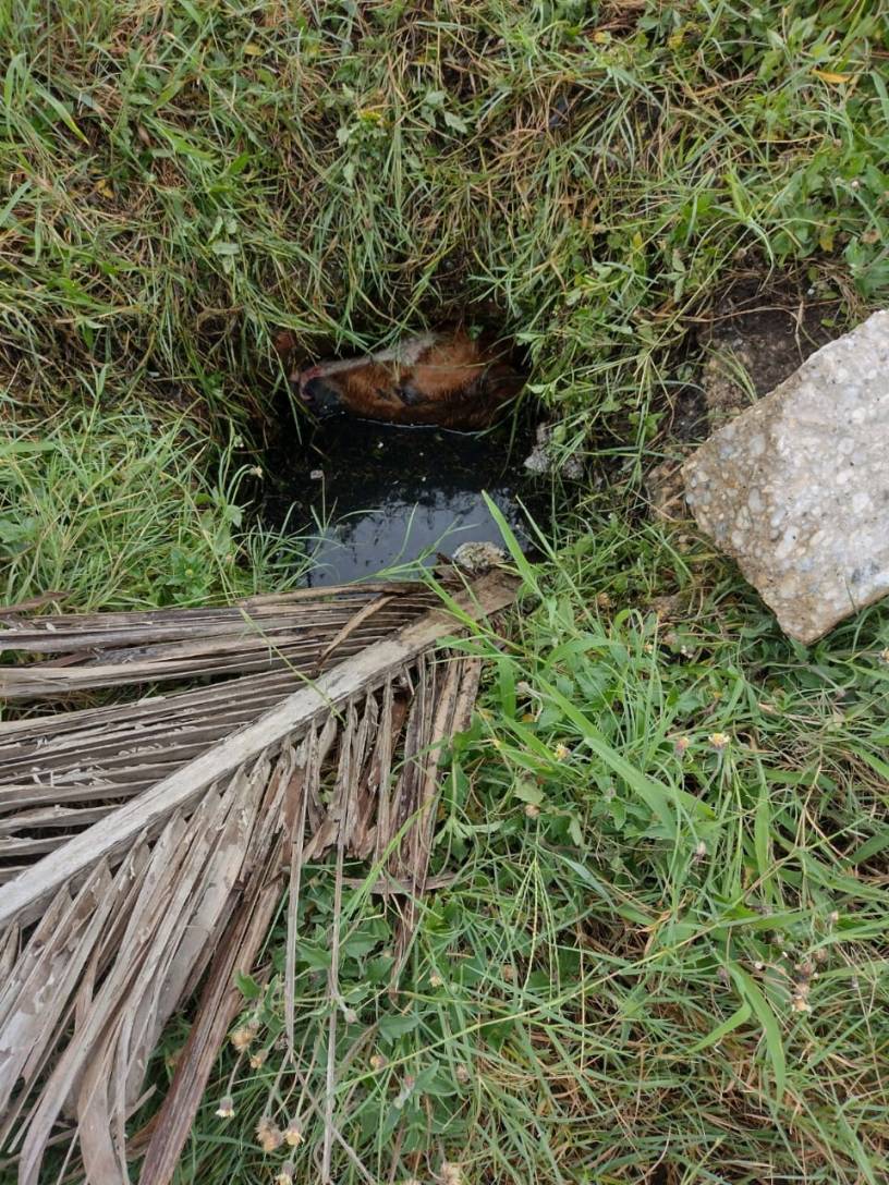 El equino pastoreaba sobre las calles Pensamiento esquina Geranio de la zona uno, cuando fue observado por una señora al momento del incidente quien pidió ayuda para sacarlo de la estrecha fosa de aguas negras.