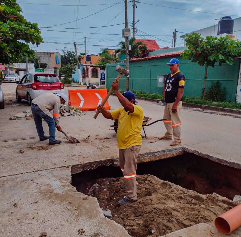 En la colonia Petrolera, en la calle Veracruz esquina Jalisco, personal de Mantenimiento Civil demolió concreto y excavó para localizar daños en la tubería y sustituirlo por uno de PVC, para detener las fugas; posteriormente rellenará y repondrá la losa.