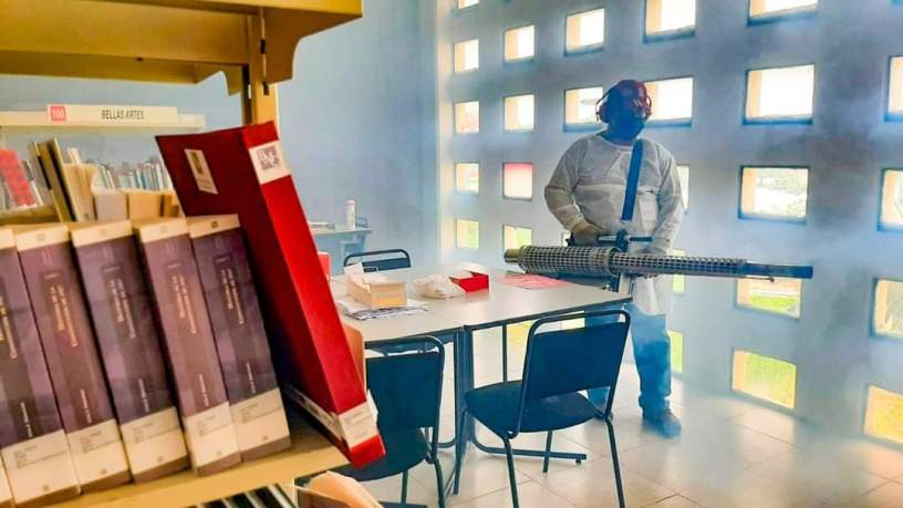 Por instrucciones del Presidente Municipal, Amado Jesús Cruz Malpica, y atendiendo la solicitud de la licenciada Alma Rosa Esparza Morales, se desinfectaron las bibliotecas: Esperanza Domínguez, Francisco Mata Aguilar, Virgilio Uribe de Mundo Nuevo, Cornelius Versteeg y la Oralia Bringas.