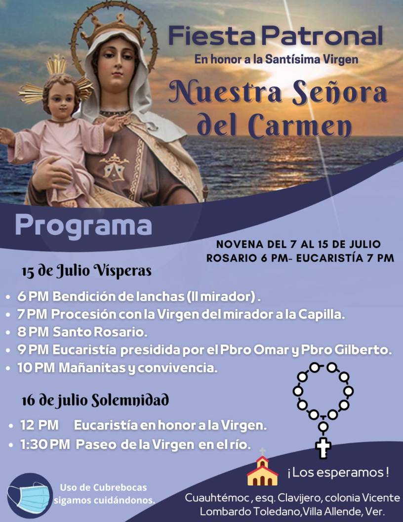 De acuerdo a su programa, los feligreses de la capilla «Nuestra Señora del Carmen» invitan a participar este viernes en punto de las 18:00 horas a la bendición de las lanchas en el segundo mirador del Malecón ribereño y posteriormente se llevará a cabo una procesión con la Virgen del Carmen a la Capilla ubicada en las calles Clavijero esquina Cuauhtémoc donde se harán tradicionales mañanitas.