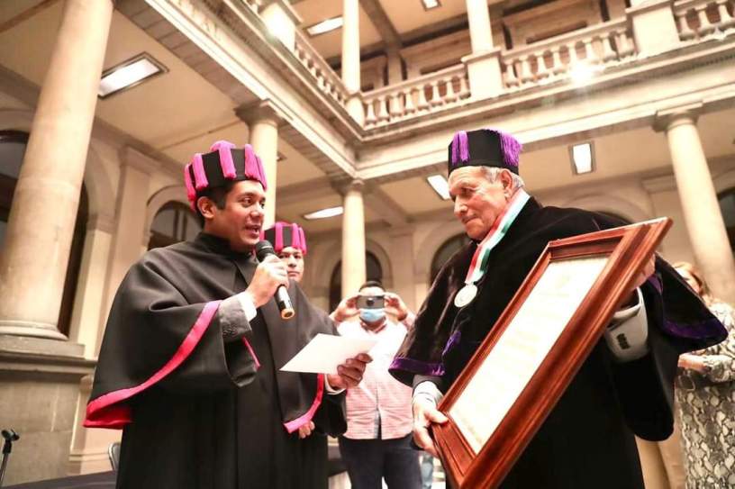 Ataviado en su traje de gala como autoridad académica, portando su toga, muceta y birrete, Sergio Gutiérrez encabezó la ceremonia conjunta, celebrada en el Club de Periodistas de la Ciudad de México.