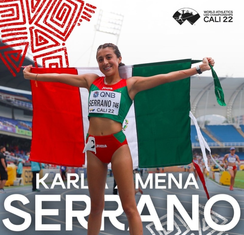 Karla Ximena Serrano, atleta de 18 años de edad, consiguió la primera medalla de oro para México en el Campeonato Mundial de Atletismo Sub 20 en Cali, Colombia, tras vencer a las japonesas Yanai y Oyama en los 10 mil metros de la marcha femenil este viernes.