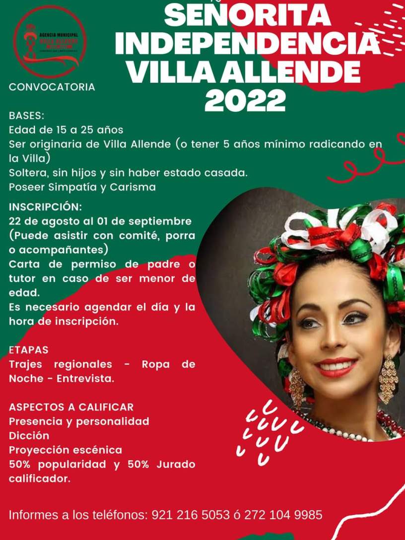 En el marco de los festejos de la Independencia de México, la agencia municipal de Villa Allende convoca a las jóvenes a participar en la elección a Señorita Independencia 2022.