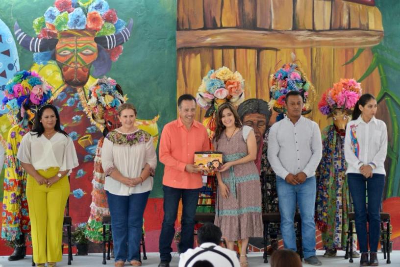 “Vamos a seguir recorriendo los pueblos, rescatando sus identidades, disfrutando de su cultura y del arte culinario”, manifestó, después de entregar a niñas y niños de la localidad ejemplares del libro Vale, Max y el tesoro de los datos personales, publicado en español y tének, además de una versión en braile al Sistema Estatal para el Desarrollo Integral de la Familia.