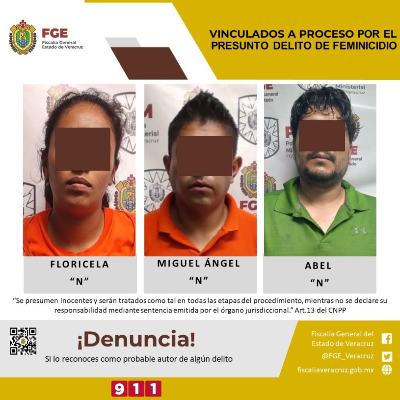 Xalapa, Ver., 17 de octubre de 2022.- La Fiscalía Especializada en Investigación de Delitos de Violencia contra la Familia, Mujeres, Niñas y Niños y de Trata de Personas obtuvo vinculación a proceso en contra de Abel “N”, Floricela “N” y Miguel Ángel “N” por el presunto delito de feminicidio cometido en agravio de la víctima de identidad resguardada.