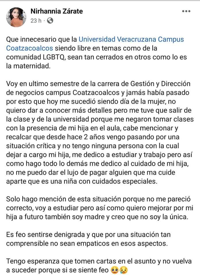 “No quiero dar a conocer más detalles pero me tuve que salir de la clase y de la universidad porque me negaron tomar clases con la presencia de mi hija en el aula, cabe mencionar y recalcar que desde hace 2 años vengo pasando por una situación crítica y no tengo ninguna persona con la cual dejar a cargo mi hija, me dedico a estudiar y trabajo pero así como hago todo lo demás me dedico al cuidado de mi hija, no me puedo dar el lujo de pagar alguien que me la cuide, aparte que es una niña con cuidados especiales”, explicó en su publicación la joven madre.