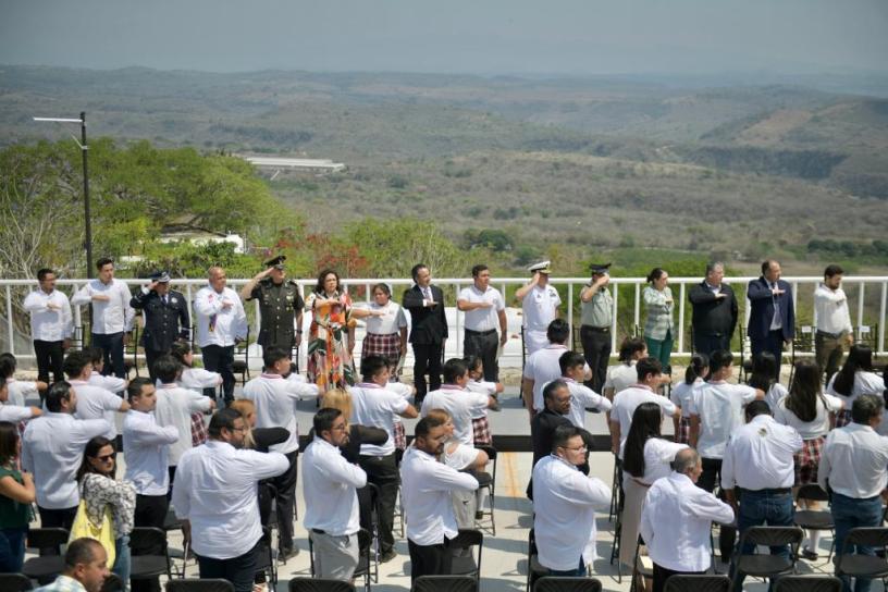 Alrededor del asta monumental, estuvieron también las titulares de los Poderes Legislativo y Judicial, diputada Margarita Corro Mendoza y magistrada Lisbeth Aurelia Jiménez Aguirre; integrantes de la Coordinación Estatal para la Construcción de la Paz; el alcalde de Emiliano Zapata, Erick Ruiz Hernández, así como estudiantes y docentes del Telebachillerato de Cerro Gordo.