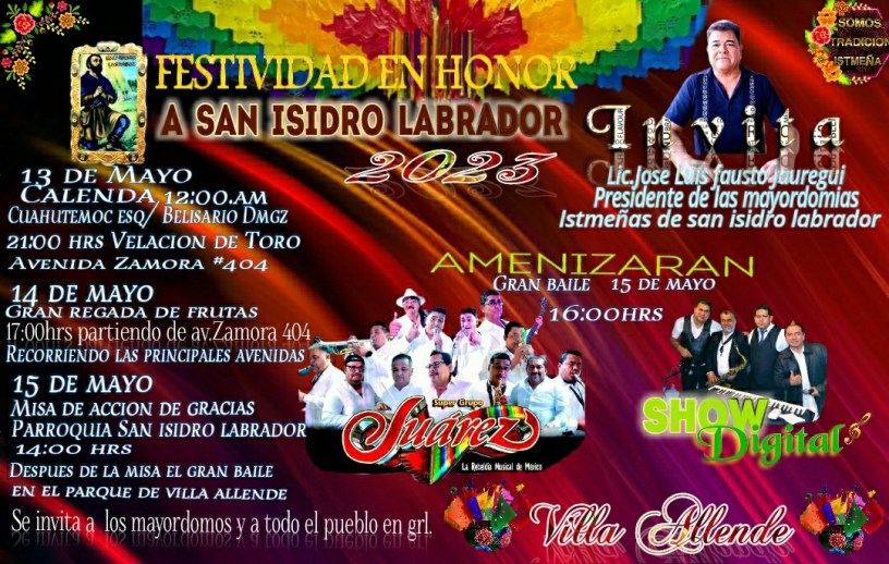 Con el propósito de resaltar las tradiciones culturales de villa Allende, la sociedad istmeña invita a las festividades en honor a San Isidro Labrador que se desarrollarán del 13 al 15 de mayo donde este año amenizará la fiesta el grupo de Juárez.