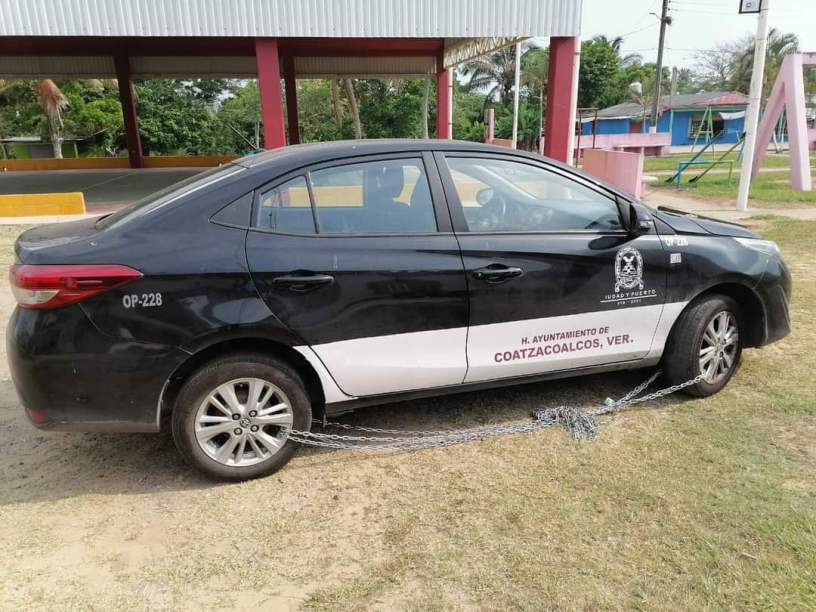 Un automovil con logotipo del Ayuntamiento de Coatzacoalcos, fue encadenado por habitantes del ejido Colorado, esto como medida de protesta, porque el año pasado no hubo ninguna obra en esta comunidad rural.