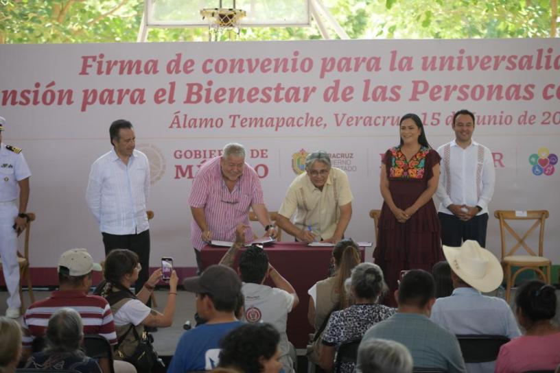 Desde este municipio citrícola, el gobernador Cuitláhuac García Jiménez y la secretaria de Bienestar, Ariadna Montiel Reyes, firmaron el convenio para la universalidad del programa, que establece la aplicación de un 50 por ciento de presupuesto estatal y el otro 50 de la Federación.