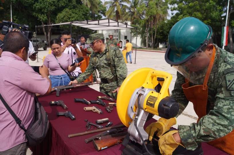 Después del acto protocolario, el personal militar, acompañados por el General de la 29/a. Zona Militar e invitados especiales, procedieron al proceso de destrucción de las armas de fuego.