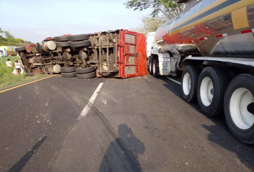 Uno de las unidades de grandes dimensiones involucradas en el percance que llevaba alimento para animales de granja de la empresa CAMPI perteneciente a Grupo Bachoco, volcó bloqueando prácticamente todo el carril.
