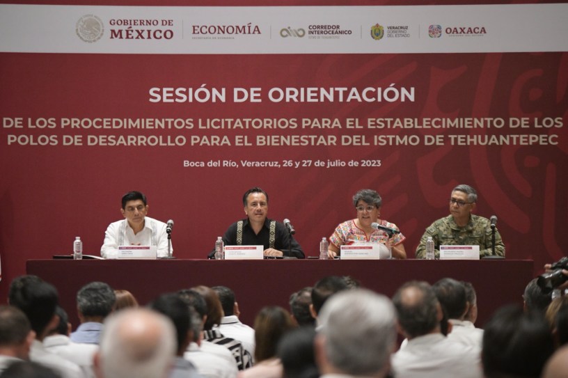 Boca del Río Ver., 26 de julio de 2023.- Al sector empresarial interesado en establecerse en los Polos de Desarrollo para el Bienestar del Corredor Interoceánico del Istmo de Tehuantepec, los gobernadores de Veracruz, Cuitláhuac García Jiménez; de Oaxaca, Salomón Jara Cruz y la secretaria de Economía, Raquel Buenrostro Sánchez, presentaron el paquete de incentivos fiscales.