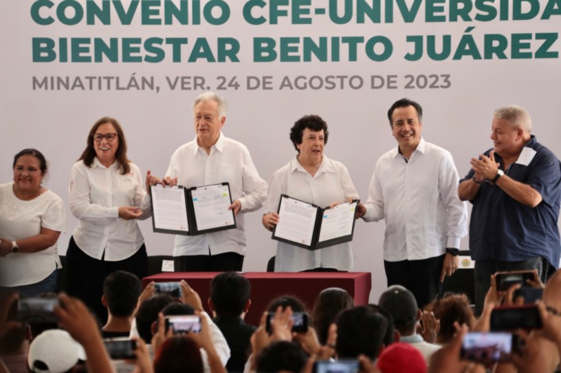 Minatitlán, Ver., 24 de agosto de 2023.-* En el marco de la alianza entre las Universidades para el Bienestar Benito Juárez (UBBJ) y la Comisión Federal de Electricidad (CFE), el gobernador Cuitláhuac García Jiménez deseó el mayor de los éxitos a los estudiantes que, tras su esfuerzo y dedicación en proyectos energéticos, integrarán las filas de la empresa pública más grande e importante de México.