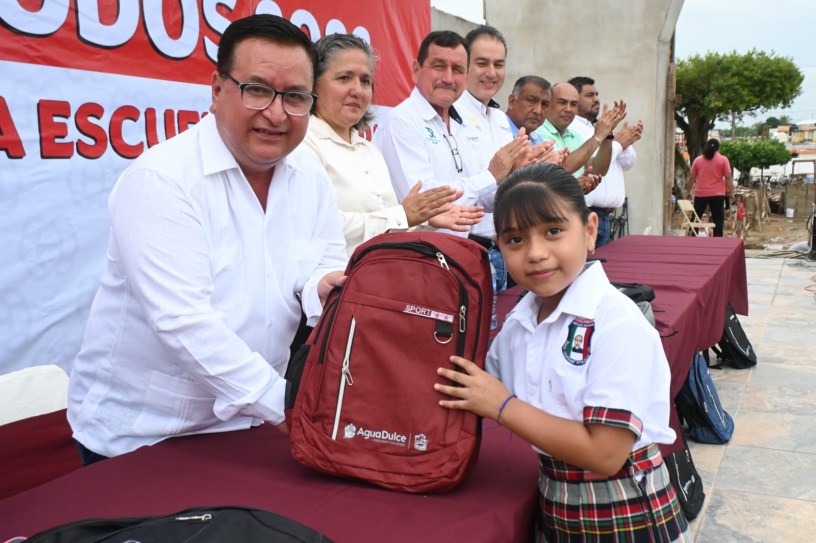 Agua Dulce, Ver. – En un acto pletórico de júbilo infantil y sin precedentes en la historia de la educación en Agua Dulce, el alcalde José Noé Castillo Olvera entregó este viernes más de cinco mil mochilas con útiles escolares a estudiantes de 38 escuelas primarias urbanas y rurales en el marco del programa “La Tarea es de Todos”.