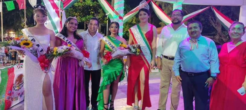 Acompañado de las Señoritas Independencia, Patria y Libertad, así como personal de la agencia municipal, su esposa e hija menor, Trujillo Hernández recordó a los héroes que nos dieron patria y ondeó la Bandera Nacional en el kiosco del parque Benito Juárez.