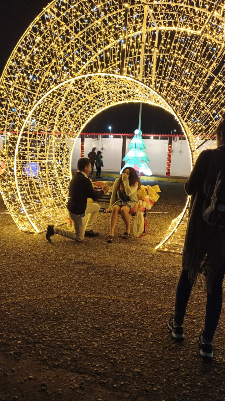 La romántica escena fue capturada a través de una fotografía, en la que se observa al novio arrodillado ante su amada con el anillo entre sus manos, teniendo como fondo una enorme esfera iluminada por miles de luces.