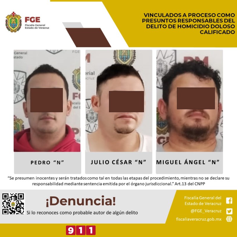 Ozuluama, Ver., 28 de diciembre de 2023.- La Fiscalía Regional Tantoyuca obtuvo vinculación a proceso en contra de Miguel Ángel “N”, Julio César “N” y Pedro “N” como presuntos responsables del delito de homicidio doloso calificado en agravio de la víctima identificada con las iniciales N.G.A.