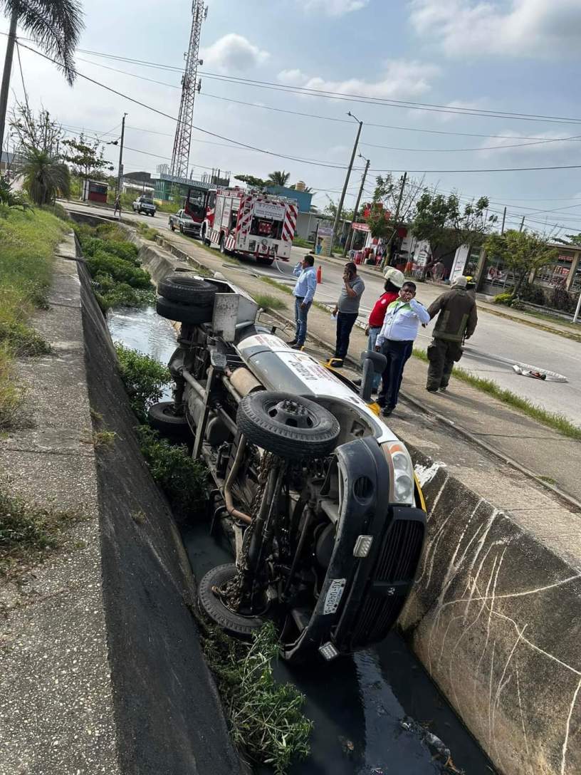 Una camioneta de la empresa El Gallito cayó a un canal de aguas negras, ubicado en la calle Francisco Mata de la colonia Puerto Esmeralda