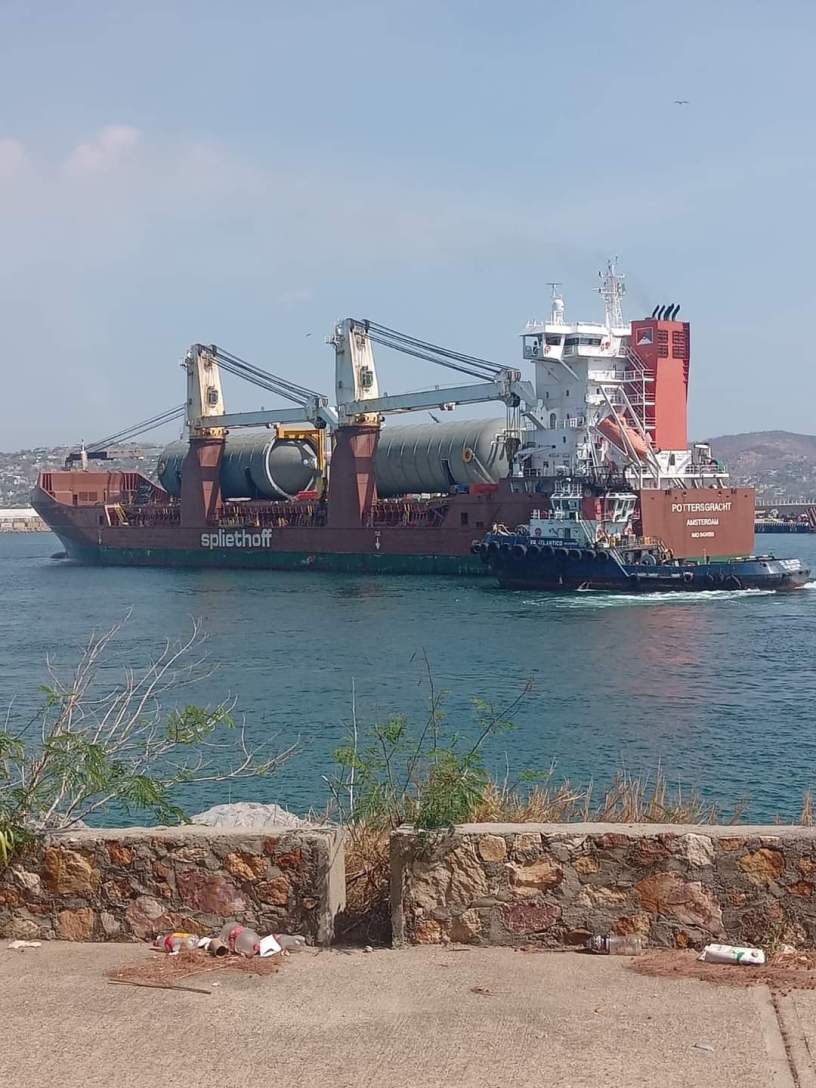 SALINA CRUZ, #OAXACA.- Como parte de los trabajos del Gobierno Federal en el interior de la Refinería, hoy por la mañana arribó a este puerto el buque Potters Grancht con equipos de grandes dimensiones que serán trasladados a la Refinería Antonio Dovalí Jaime.