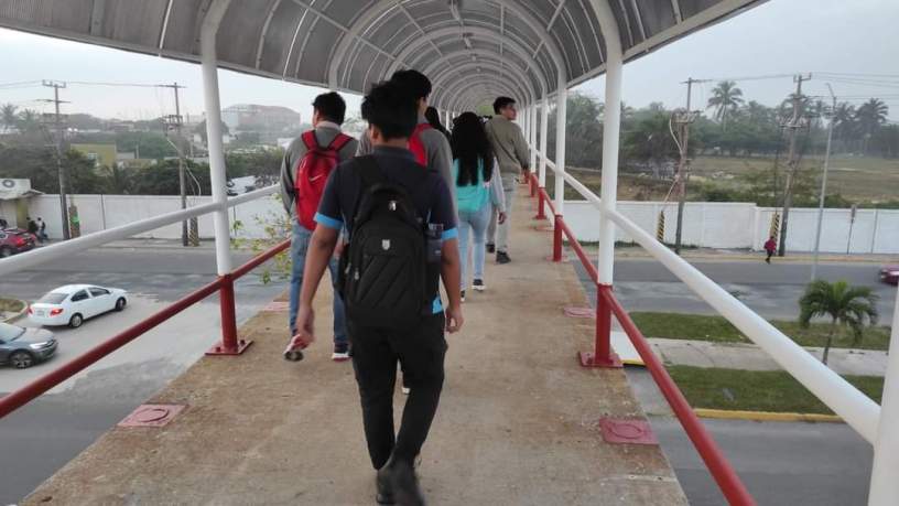 Coatzacoalcos, Ver., 28 de febrero de 2024.- Estudiantes del Instituto Tecnológico Superior de Coatzacoalcos, trabajadores y habitantes de colonias al poniente de la ciudad cruzan con mayor seguridad la avenida Universidad Veracruzana, al usar el puente peatonal recién rehabilitado por el Gobierno que preside Amado Cruz Malpica.
