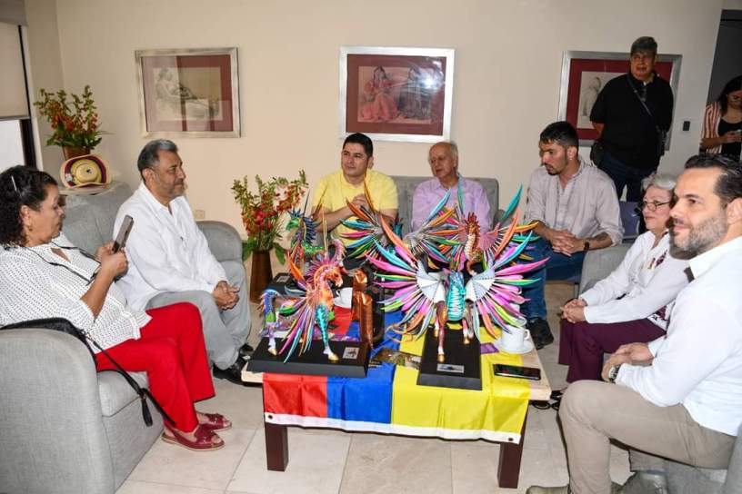 Tras degustar un auténtico café colombiano y escuchar una reseña del aromático, Cruz Malpica y Hernández Aguilar entregaron a los invitados alebrijes hechos a mano por artesanos oaxaqueños denominados ‘Pegasus’, como testimonio de agradecimiento por este intercambio artístico, gastronómico y cultural.