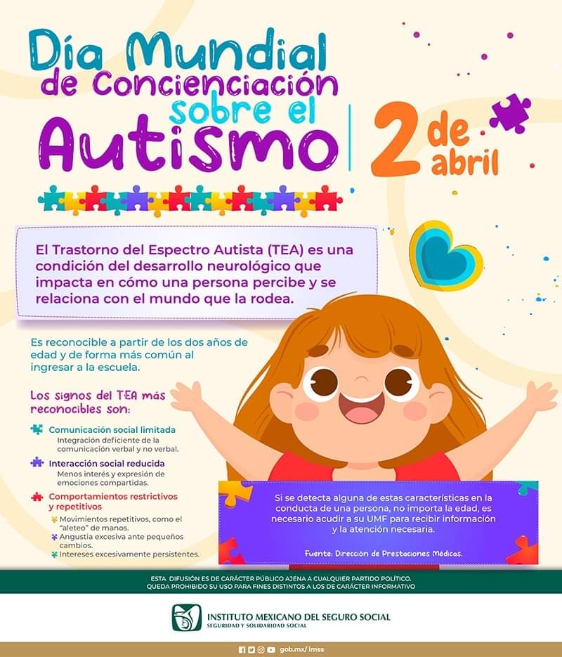 El Instituto Mexicano del Seguro Social (IMSS) en Veracruz Sur exhorta a padres de familia a conocer e identificar los signos y síntomas del Trastorno del Espectro Autista (TEA) para garantizar la atención médica necesaria y mejorar su calidad de vida.