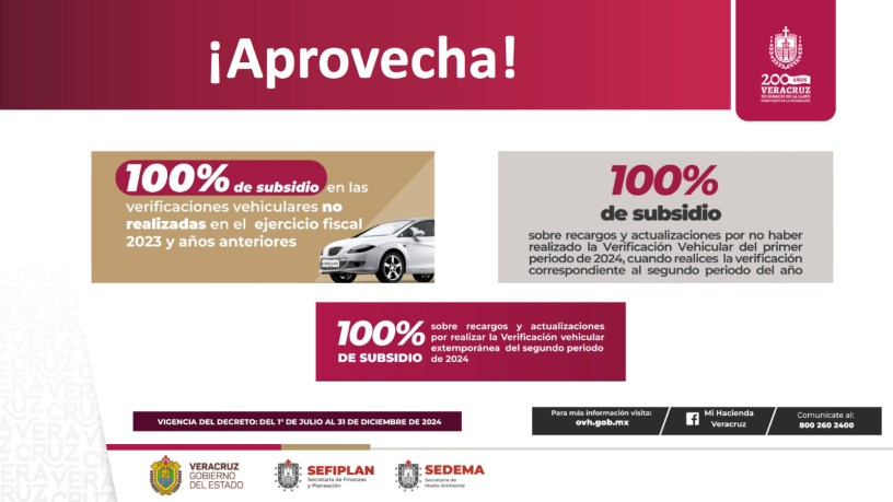 Aprovecha estos descuentos y contribuye a mejorar la calidad del aire y la salud de la población; si tienes dudas, llama al (800) 260-2400 de lunes a viernes entre las 8:00 y las 18:00 horas y sigue en Facebook la página Mi Hacienda Veracruz.