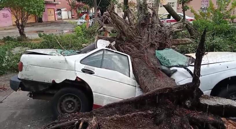 En la avenida General Anaya entre Nicolás Bravo y Vicente Guerrero del centro de la ciudad, un enorme árbol se desprendió desde la raíz y cayó encima de un auto particular marca Nissan, tipo Tsuru, color blanco con placas YRG-774-A del estado de Veracruz, mismo que terminó partido a la mitad y con el parabrisas roto.
