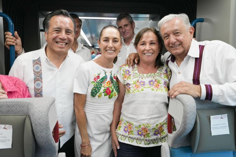 Cancún, Quintana Roo, viernes 20 de septiembre de 2024.- La gobernadora electa de Veracruz, Rocío Nahle García, acompañó al presidente Andrés Manuel López Obrador y a la presidenta electa, Claudia Sheinbaum Pardo, a la puesta en marcha de la ruta Cancún-Chichén Itzá-Teya del Tren Maya inaugurada hoy.