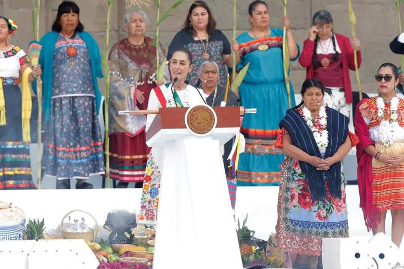 En una ceremonia con sello feminista, con mujeres como principales protagonistas, Sheinbaum recibió el bastón de mando de manos de la presidenta municipal de Chalcatongo, Oaxaca, María de Lourdes Jiménez Liera, quien le dijo en náhuatl que esa pieza de manera representa la esperanza de millones de mujeres mexicanas.