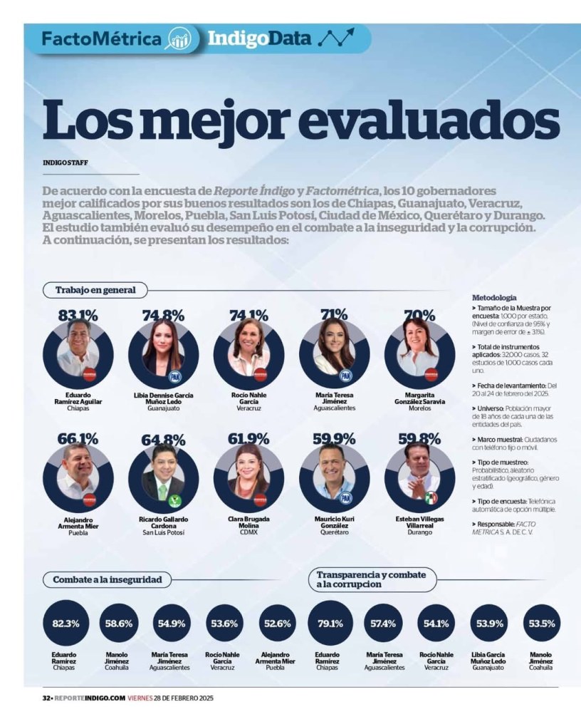 Xalapa, Ver., viernes 28 de febrero de 2025.- La gobernadora de Veracruz, Rocío Nahle García, se encuentra entre los mandatarios mejor calificados del país, de acuerdo con la encuesta de Reporte Índigo y Factométrica, que evaluó el desempeño de los gobernadores en trabajo general, combate a la inseguridad y transparencia.